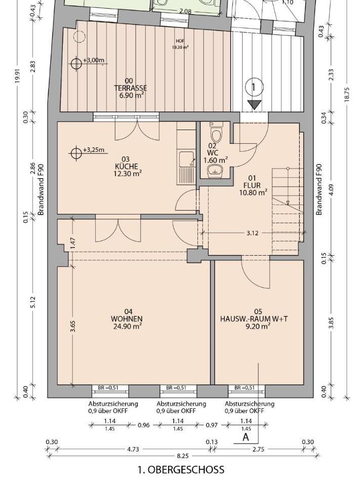 Whg-3 ca. 75 m²: 2. OG (1. Ebene 44,40 m²): Flur, Wohn-/Esszimmer, Küche, Gäste-WC.